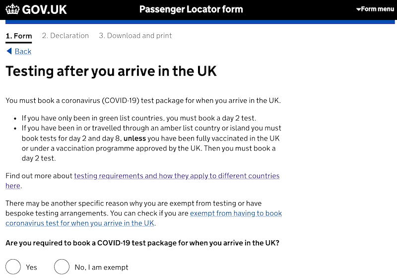 If you're entering the United Kingdom, you'll also be asked if you're required to book a coronavirus test for the second day you're in the country. Day two testing is required if you're coming from an amber list country and are skipping quarantine on account of being vaccinated (if you're spending under two days in the UK, then there's no need to get a day two test).