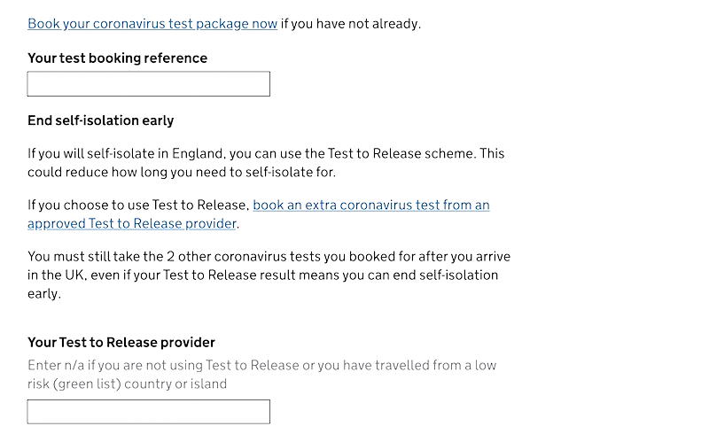 If you answer yes, you'll need to provide your test booking reference. You can only get tested through an official provider (here's the list of eligible providers), and once you book a test, you'll be given a test booking reference, which you'll have to enter.