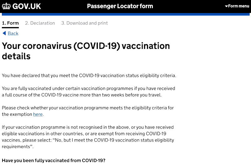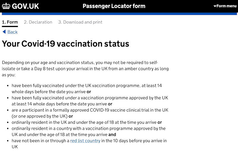 You'll then be asked about your vaccination status. That's because as of recently, fully vaccinated travelers coming from amber list countries no longer need to quarantine. So you'll be asked to confirm that you've been fully vaccinated at least 14 days prior to arriving in the UK, and that you haven't been in any red list countries in the past 10 days.